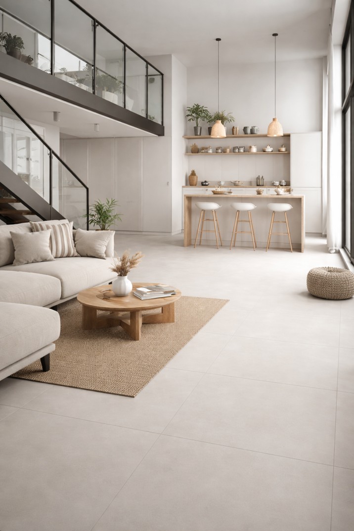 Grootformaat tegels zoals de Baltimore Perla 120×120 zijn bijzonder geliefd in moderne interieurs vanwege hun rustige uitstraling. Door het beperkte aantal voegen ontstaat een bijna naadloos vloeroppervlak dat de architectuur van de ruimte versterkt.