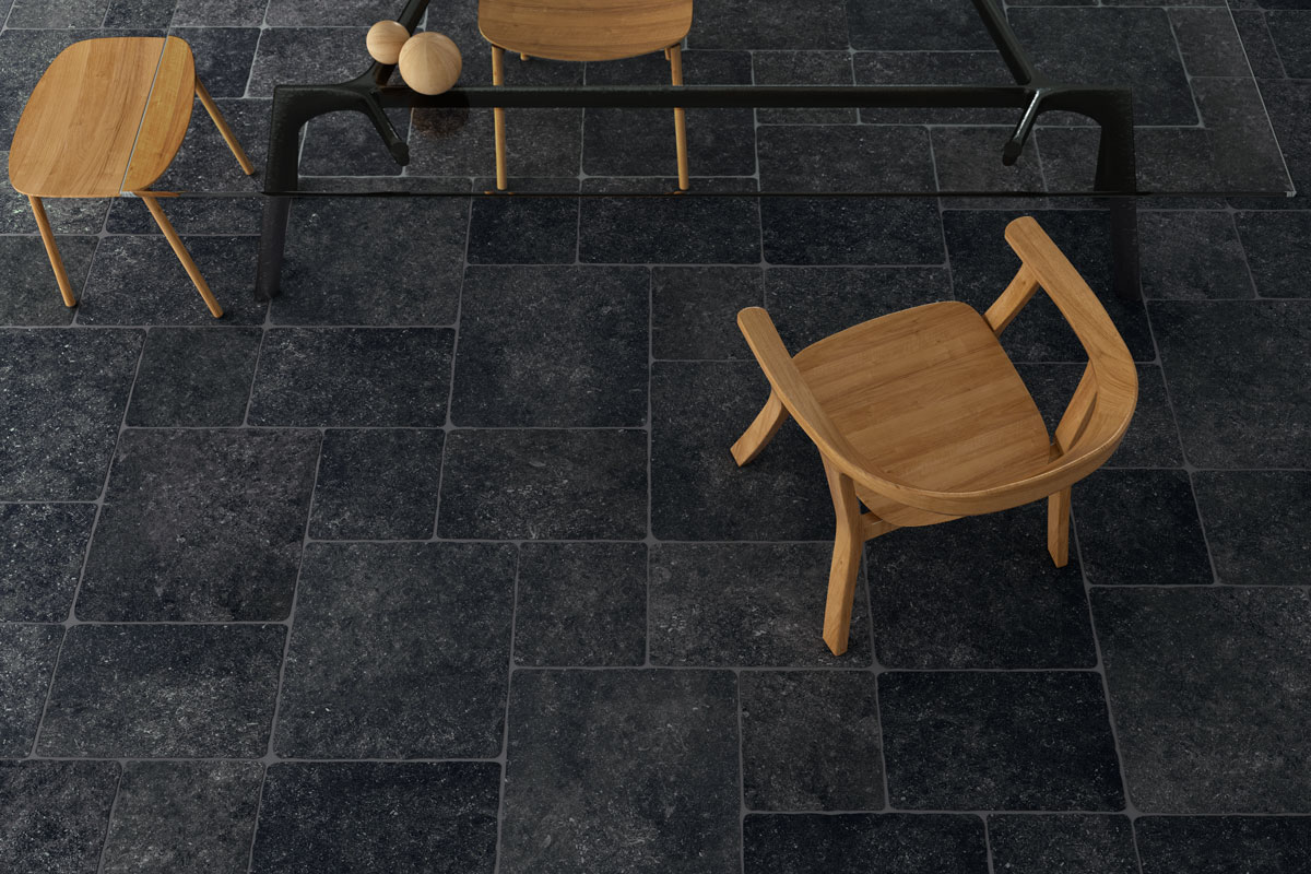 Blauwsteen Black Module is geïnspireerd op authentieke Belgische blauwsteen in zijn meest expressieve, donkere vorm. De rijke zwart- en antraciettinten, gecombineerd met subtiele veroudering en natuurlijke textuur, zorgen voor een vloer met diepte en uitstraling.