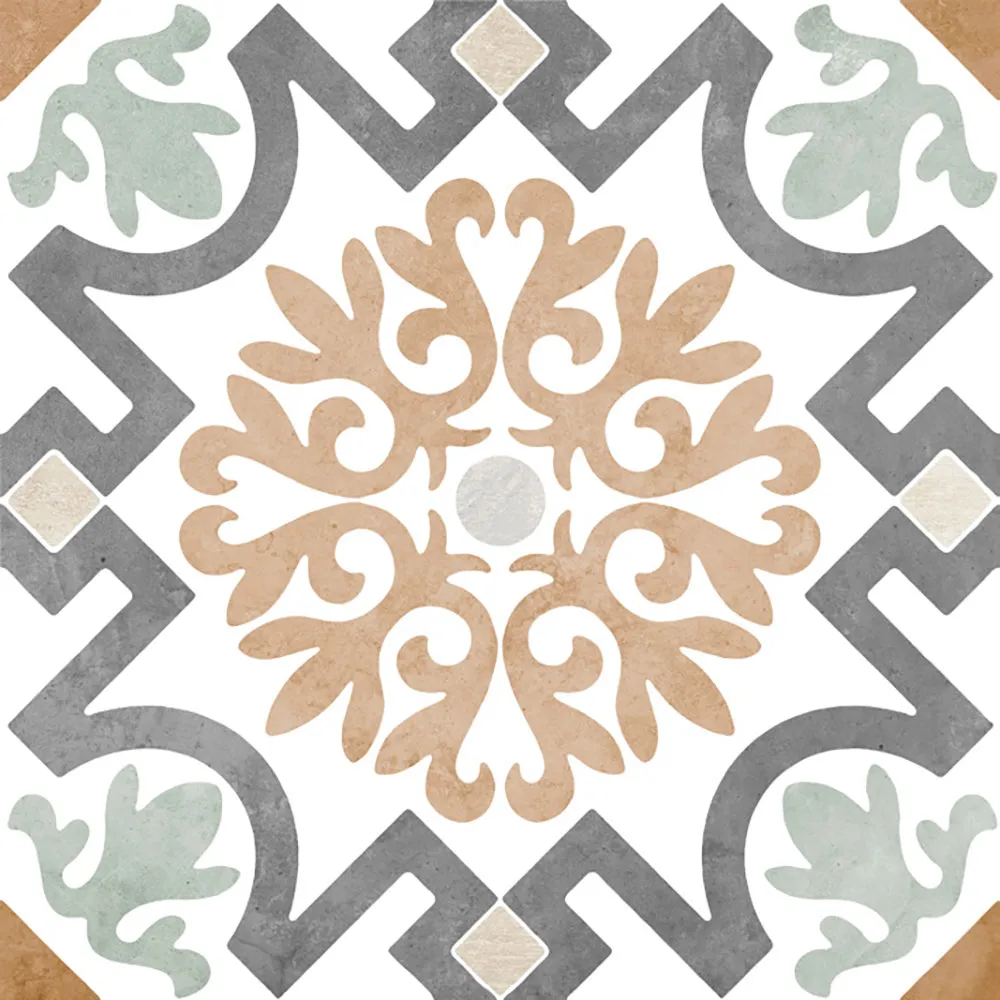 De Cosmopolitan Oslo 15×15 straalt de charme uit van traditionele Portugese en Mediterrane patroontegels, maar dan in een modern keramisch jasje. Het ontwerp combineert warme beige accenten, zachte groentinten en stevige grijze lijnen, wat zorgt voor een stijlvol en tijdloos geheel.