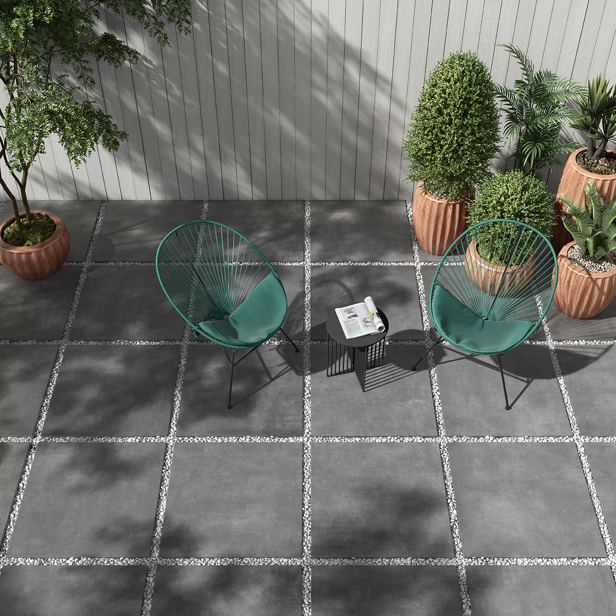 De Flux Smoke 45×45 onderscheidt zich door zijn subtiele, rokerige grijstint die net iets warmer en zachter oogt dan klassiek antraciet. De fijne betonstructuur en lichte kleurnuances geven de tegel diepte en karakter, zonder het geheel druk te maken.