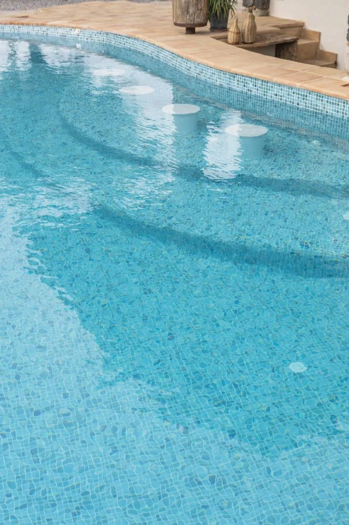 De Nature Sky 3.8×3.8 van Vidrepur is een frisse glasmozaïek in lichte blauw- en aquatinten, ideaal voor zwembaden, wellness en heldere badkamerconcepten.