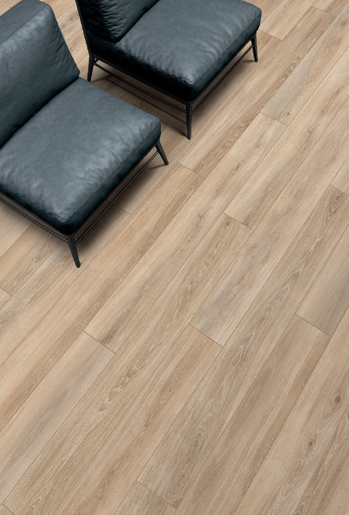 De subtiele honingkleur geeft warmte en sereniteit aan de ruimte, terwijl de lichte houtnerven zorgen voor een natuurlijke diepte.